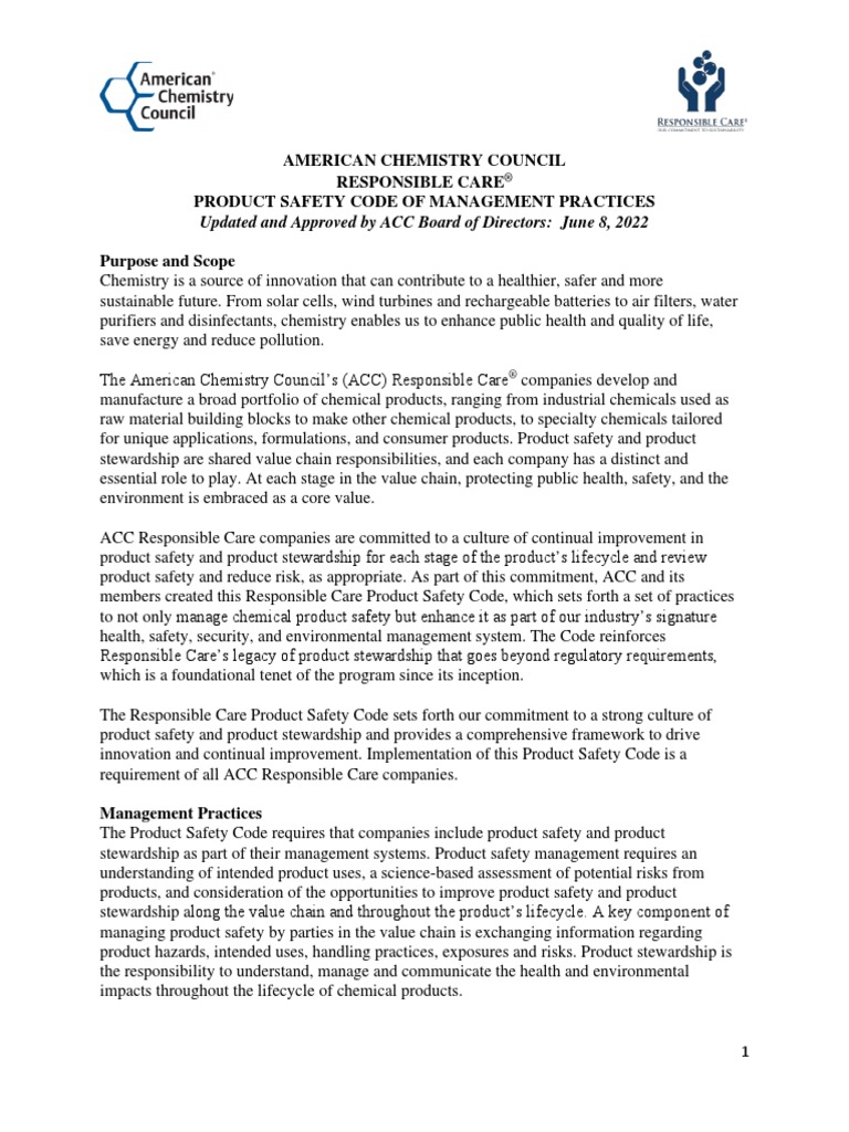 American Chemistry Council Responsible Care Product Safety Code of
